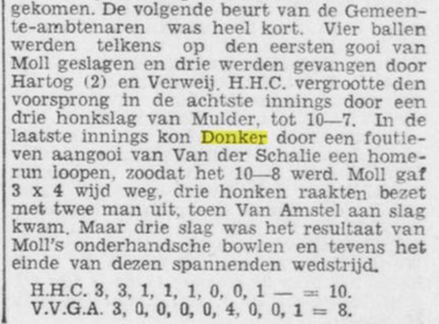 V.V.G.A. - HonkbalGerrit Donker werd jeugdlid van VVGA Honkbal in 1936. Hij zat jarenlang in hetzelfde team met Jan Smoorenburg en Kees (Isidoor) Monas. In 1939 werden ze met z'n drieën overgeschreven naar de senioren en gingen ze in het tweede 9-tal spelen. In 1939 speelde ook zijn vriend Jacob Bons ( 1919 - ?) honkbal bij VVGA; hij speelde in het derde 9-tal. Alle vier komen ze in het verdere verhaal voor.